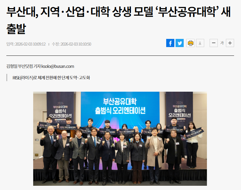 부산대, 지역·산업·대학 상생 모델 ‘부산공유대학’ 새 출발 (부산일보, 2026.02.03.) 작성자운영자 작성일자2026-03-06 16:00:29 조회11 (이하 생략)보도자료 바로가기: https://www.busan.com/view/busan/view.php?code=2026020309553467138