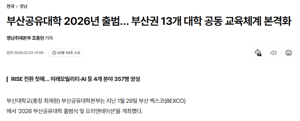 부산공유대학 2026년 출범… 부산권 13개 대학 공동 교육체계 본격화 (아시아경제, 2026.02.03.) 작성자운영자 작성일자2026-03-06 16:03:25 조회9 (이하 생략)보도자료 바로가기: https://www.asiae.co.kr/article/2026020308304179132