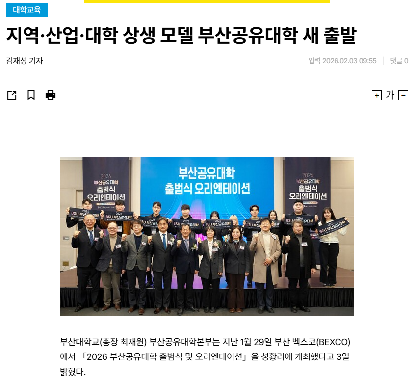 지역·산업·대학 상생 모델 부산공유대학 새 출발 (E동아, 2026.02.03.) 작성자운영자 작성일자2026-03-06 16:08:19 조회8 (이하 생략)보도자료 바로가기: https://edu.donga.com/news/articleView.html?idxno=102800