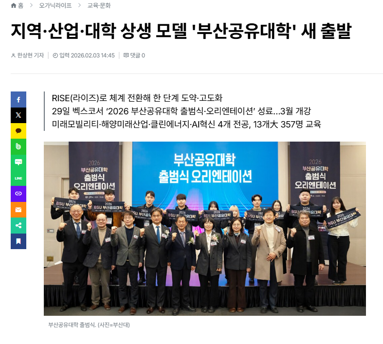 지역·산업·대학 상생 모델 '부산공유대학' 새 출발 (중앙이코노미뉴스, 2026.02.03.) 작성자운영자 작성일자2026-03-06 16:12:09 조회9 (이하 생략)보도자료 바로가기: https://www.joongangenews.com/news/articleView.html?idxno=492379