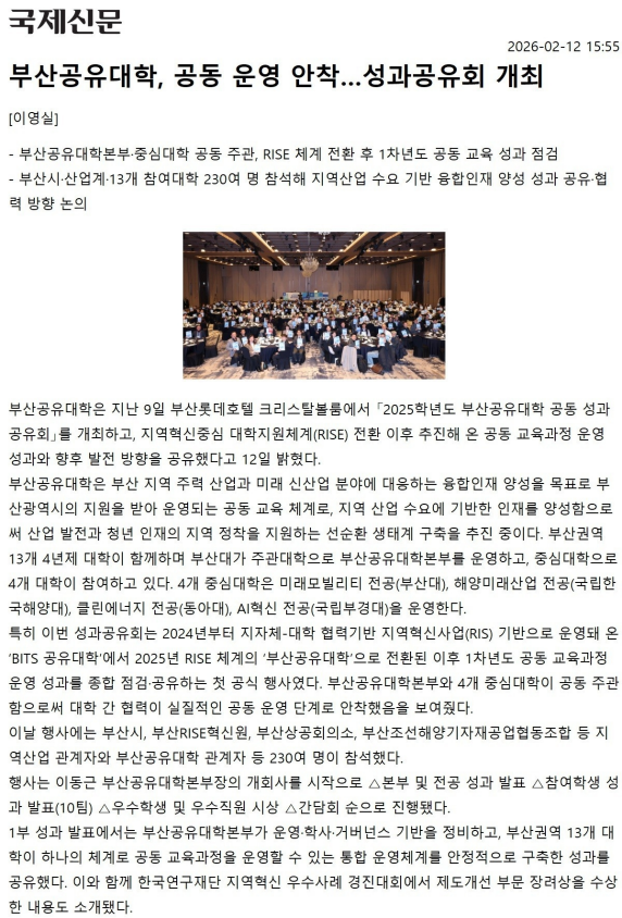 부산공유대학, 공동 운영 안착…성과공유회 개최 (국제신문, 2026.02.12.) 작성자운영자 작성일자2026-03-09 14:11:50 조회5 보도자료 바로가기: http://www.kookje.co.kr/news2011/asp/newsbody.asp?key=20260212.99099004205