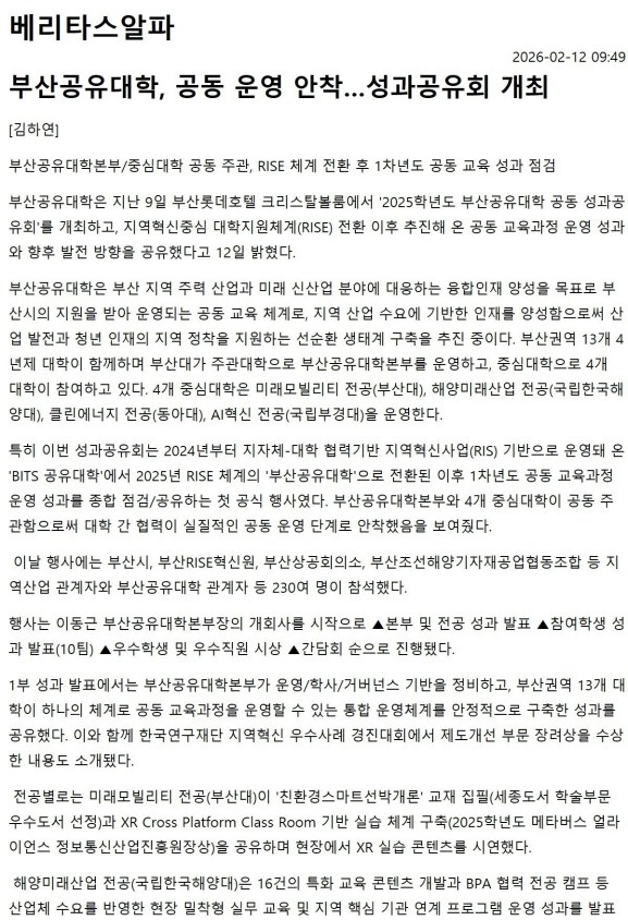 부산공유대학, 공동 운영 안착…성과공유회 개최 (베리타스알파, 2026.02.12.) 작성자운영자 작성일자2026-03-09 14:18:36 조회8 보도자료 바로가기: http://www.veritas-a.com/news/articleView.html?idxno=598136