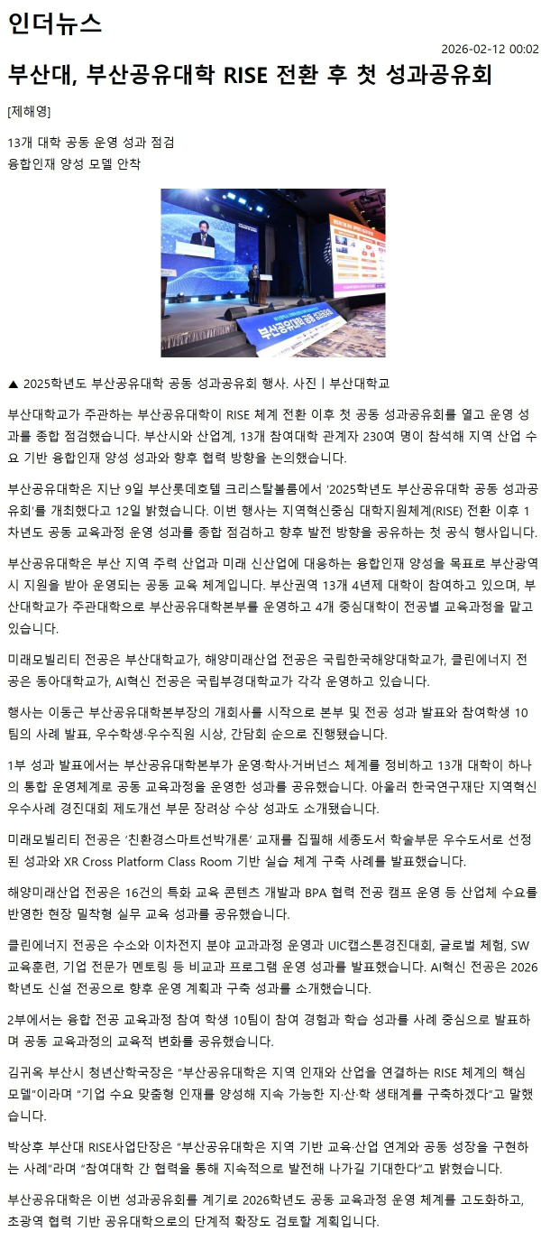 부산대, 부산공유대학 RISE 전환 후 첫 성과공유회 (인더뉴스, 2026.02.12.) 작성자운영자 작성일자2026-03-09 14:19:43 조회9 보도자료 바로가기: https://inthenews.co.kr/news/article.html?no=83133