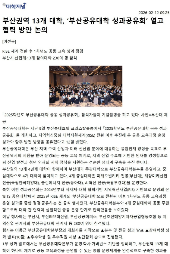 부산권역 13개 대학, ‘부산공유대학 성과공유회’ 열고 협력 방안 논의 (대학저널, 2026.02.12.) 작성자운영자 작성일자2026-03-09 14:20:52 조회10 보도자료 바로가기: http://www.dhnews.co.kr/news/view/1065572524863095