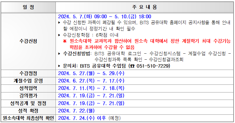 * 국립한국해양대학교, 동서대학교 소속 학생은 수강신청(정정)시 BITS 공유대학과 원소속 대학 양쪽 수강신청시스템에 모두 수강신청(정정)하시기 바랍니다.