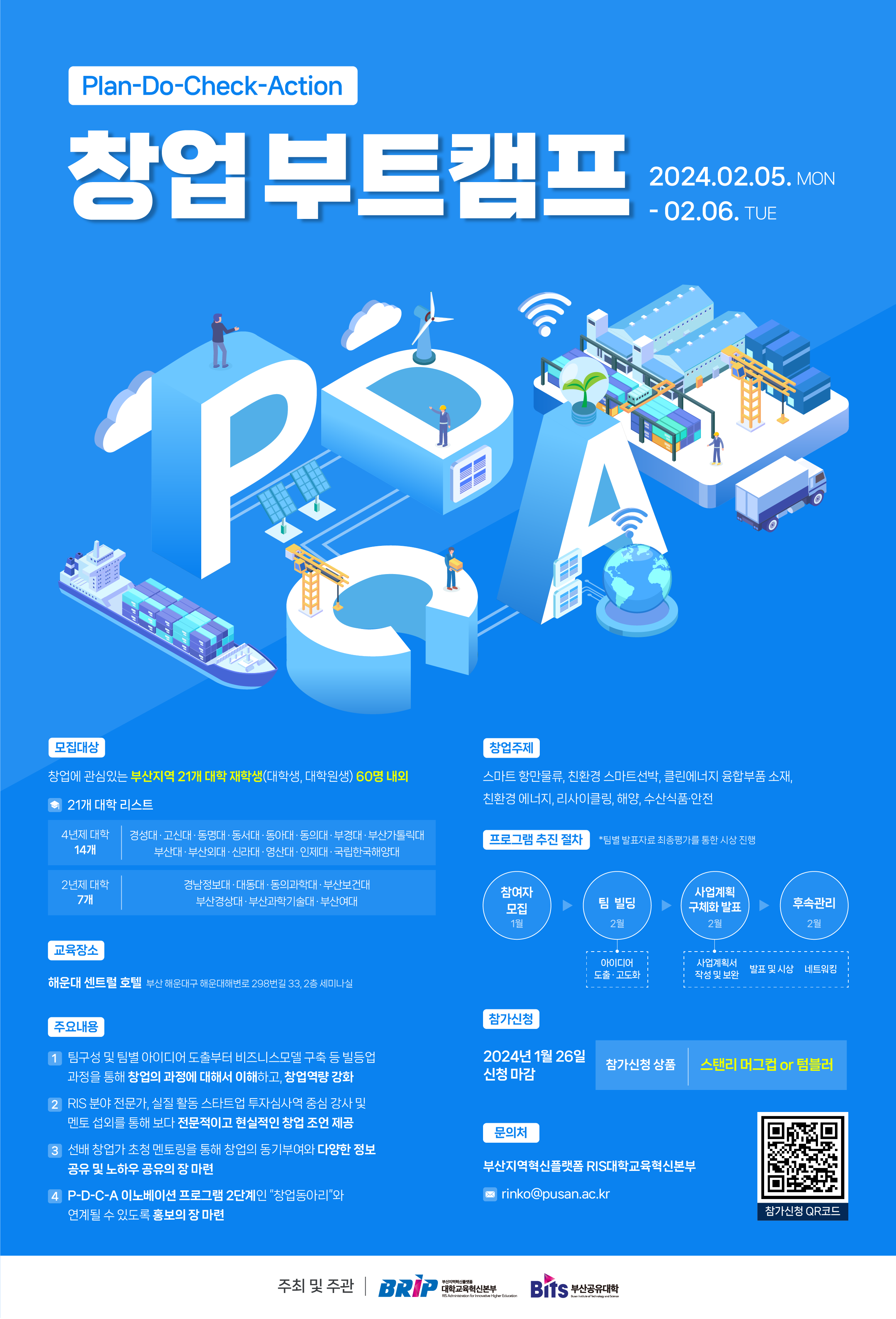 P-D-C-A 창업 이노베이션 프로그램(2024.02.05~02.06) 작성자운영자 작성일자2024-02-20 15:19:38 조회408 [PDCA 창업 부트캠프] “전문가 강의, 창업계획서 작성, 팀별 발표 활동” 첨부파일 (734.50KB)창업부트캠프 웹포스터.png