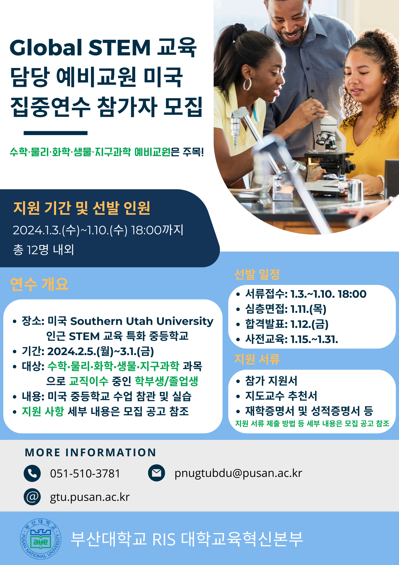 부산 프론티어 양성 프로그램(2024.02.05~03.01) 작성자운영자 작성일자2024-02-20 15:47:19 조회462 [부산프론티어 양성 프로그램 ] "글로벌 STEM 교원양성 집중 연수 프로그램” 첨부파일 (1.43MB)부산프론티어 양성 프로그램 포스터.png