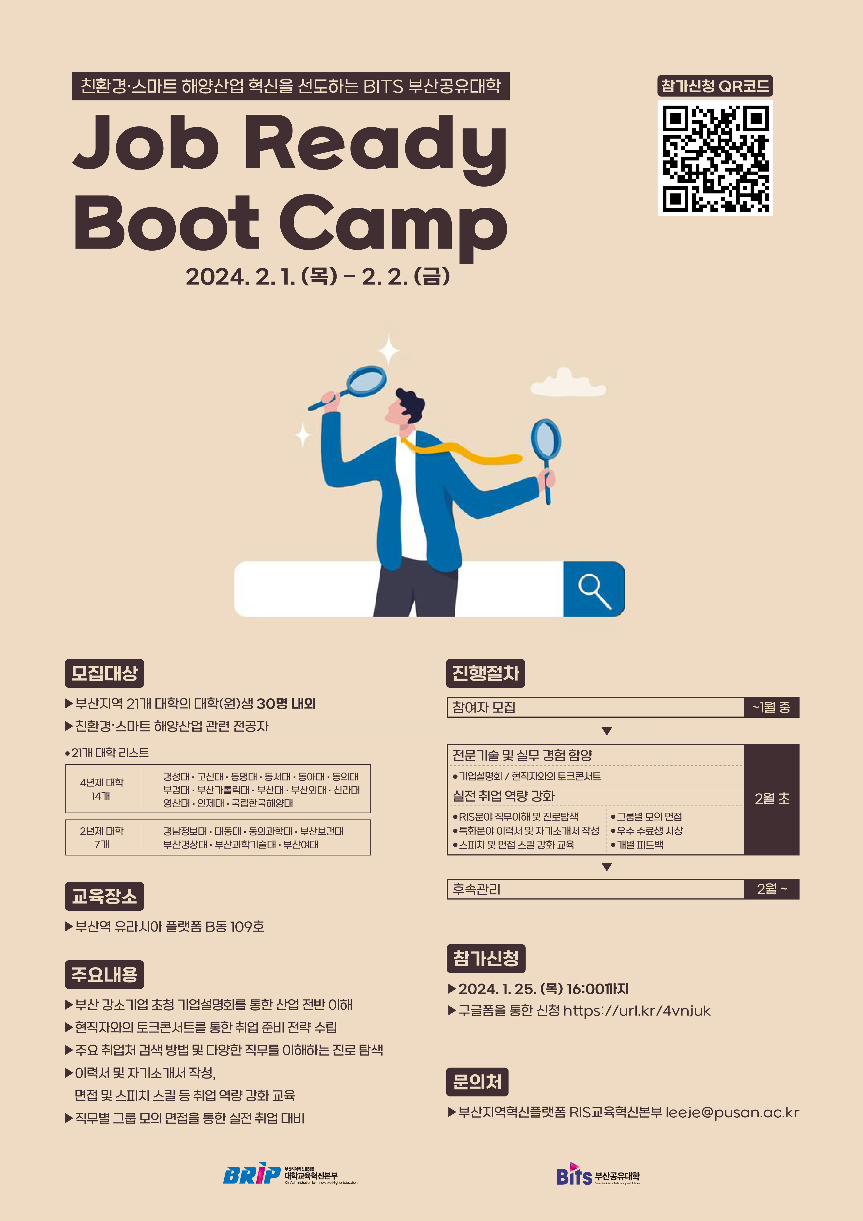 직무역량 강화형 부트캠프 운영(2024.02.01~02.02) 작성자운영자 작성일자2024-02-20 15:53:50 조회457 [직무역량강화형 부트캠프] "이력서 작성, 모의면접, 직장인의 시간관리 특강 ” 첨부파일 (2.14MB)Job Ready Boot Camp.jpg