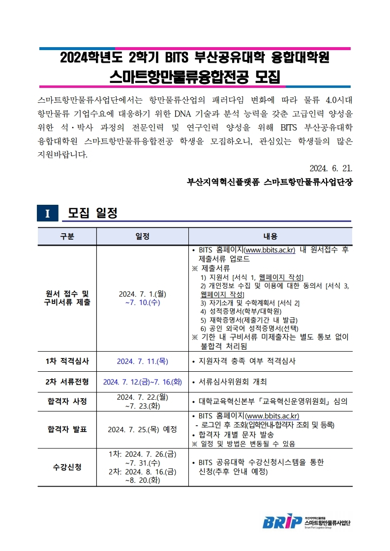★ BITS 융합대학원 스마트항만물류융합전공 모집요강 (모집기간 연장: ~2024. 7. 10.(수) 까지)